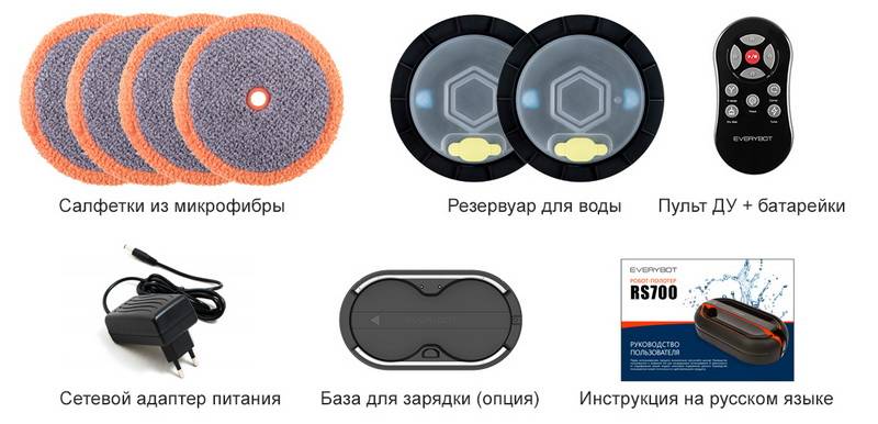 Робот полотер поставляется в комплекте с двумя парами салфеток из микрофибры, пультом дистанционного управления, блоком питания и инструкцией на русском языке с гарантийным талоном. Опционально в комплект входит база для зарядки и хранения робота.