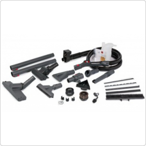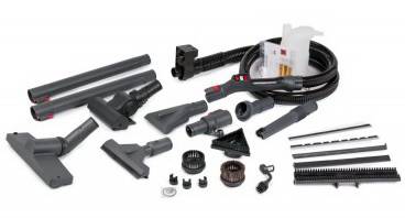 Профессиональный подход к уборке подчеркивает внушительный комплект насадок и щеток для очищения любого типа поверхности.