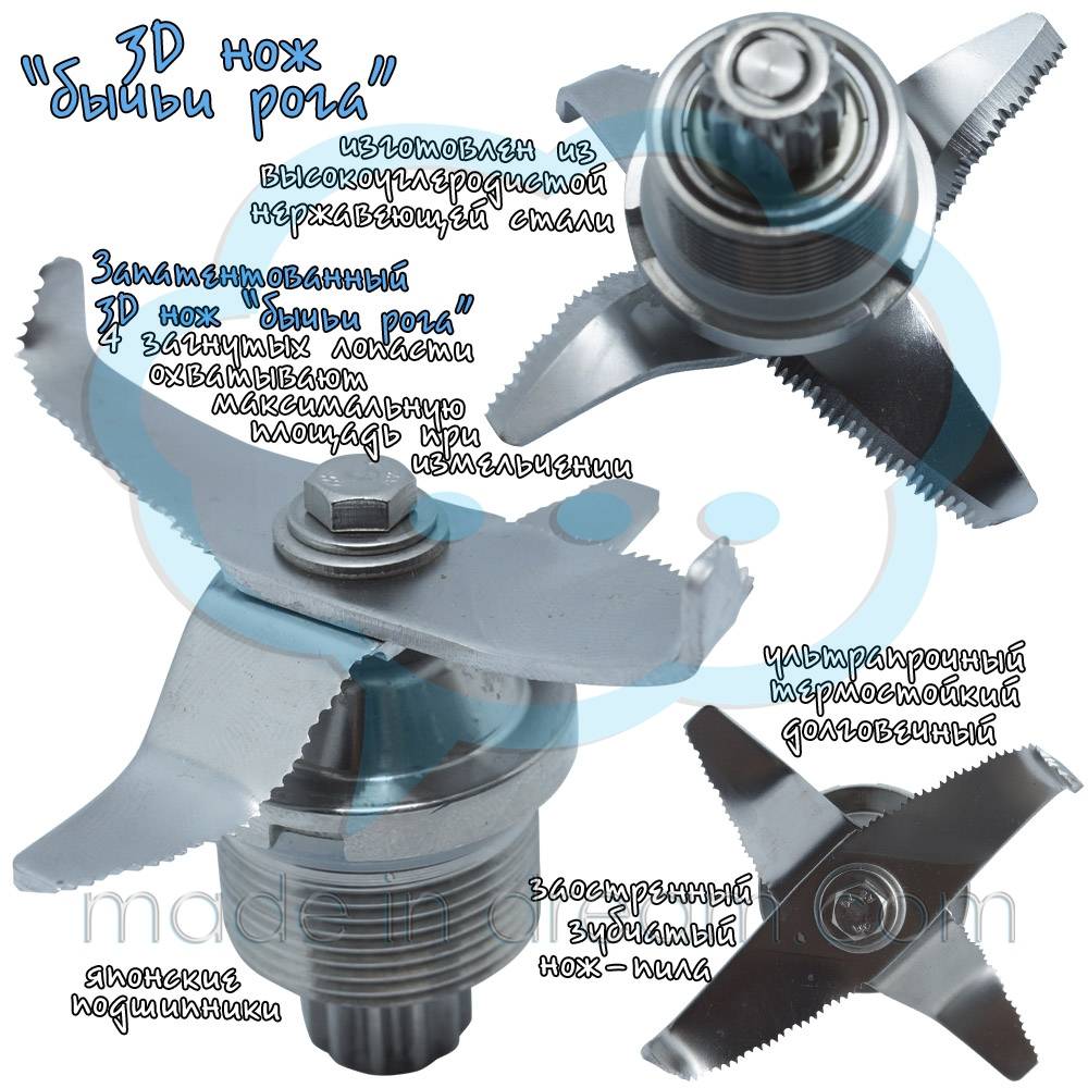 Внутри кувшина, на дне, закреплен объемный японский 6-лопастной нож-пила. Нижние, вспомогательные лезвия расположены максимально близко ко дну кувшина, что предотвращает застревание продуктов. Края двух верхних лопастей загнуты на 90°, что делает измельчение продуктов более эффективным. Оригинальные ножи с зазубренными лезвиями используются для лучшей экстракции фитоэлементов из овощей и фруктов. Материалом сцепления нож/вал является металл, что и позволяет блендеру работать при повышенных нагрузках — например, измельчать сухие зерна, замороженные продукты, лед, служить долго даже при задействовании максимальных скоростей.