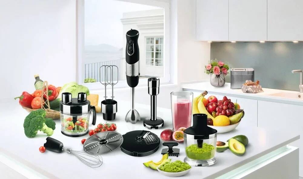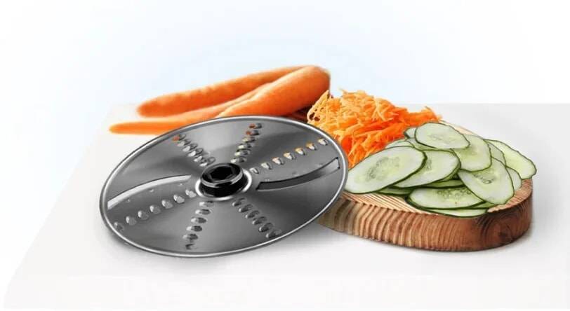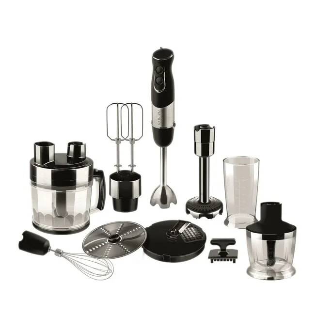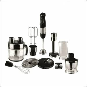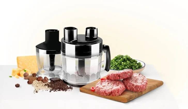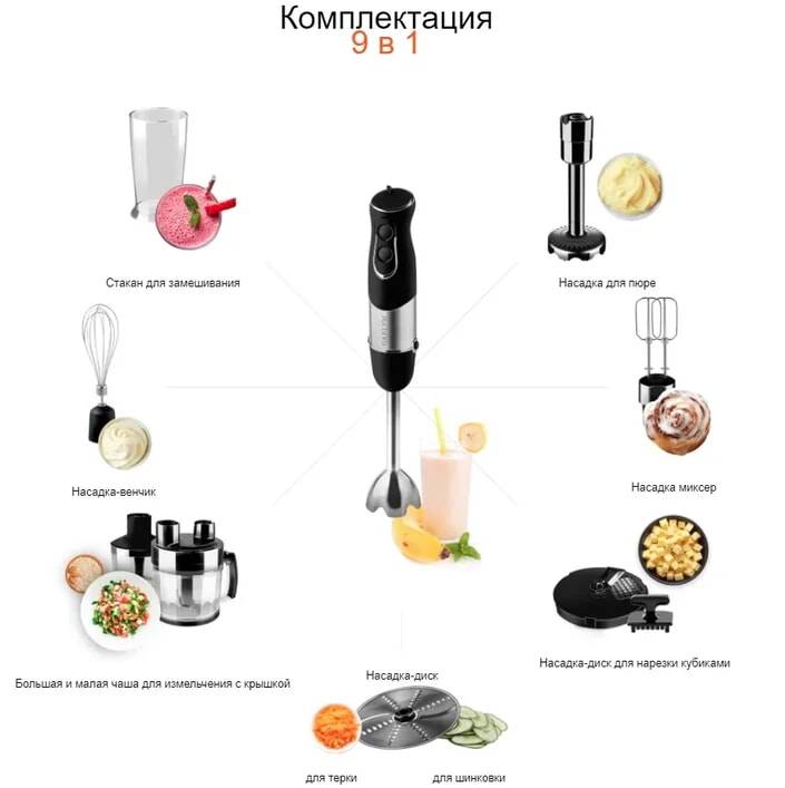 Комплектация: Блок электродвигателя — 1 шт. Большая чаша для измельчения с крышкой — 1 шт. Малая чаша для измельчения с крышкой — 1 шт. Стакан для замешивания — 1 шт. Насадка для пюре — 1 шт. Насадка-блендер — 1 шт. Насадка-венчик — 1 шт. Насадки для взбивания — 2 шт. Насадка-диск для нарезки кубиками -1 шт. Насадка-диск для шинковки/терки — 1 шт. S-образные ножи (для большой и малой чаш) — 2 шт. Толкатель -1 шт. Щетка для очистки решетки — 1 шт.