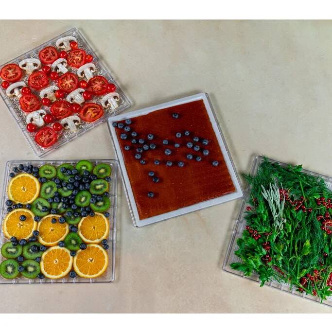 Материал поддонов: Материал уровней - пищевой пластик; Материал поддонов для пастилы - пищевой пластик Материал сеток для сушки трав - пищевой пластик
